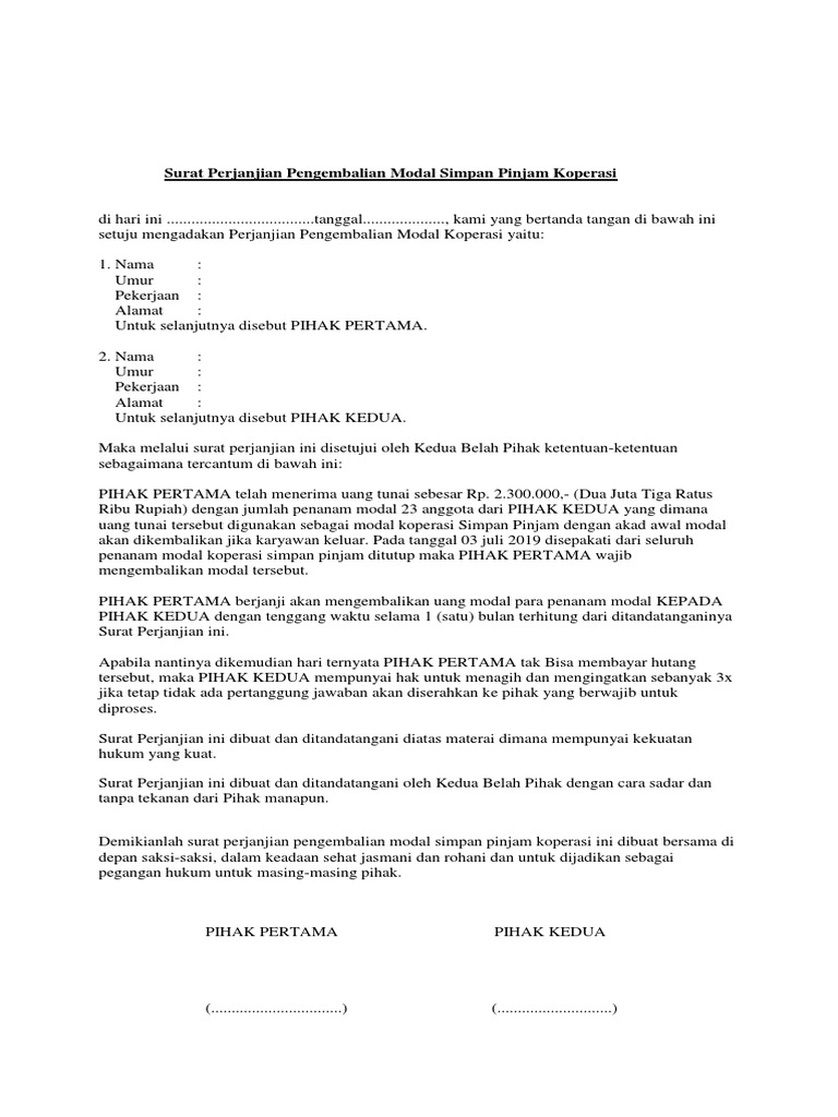 Contoh Surat Perjanjian Ringkas Penanam Modal Dalam Koperasi Malaysia